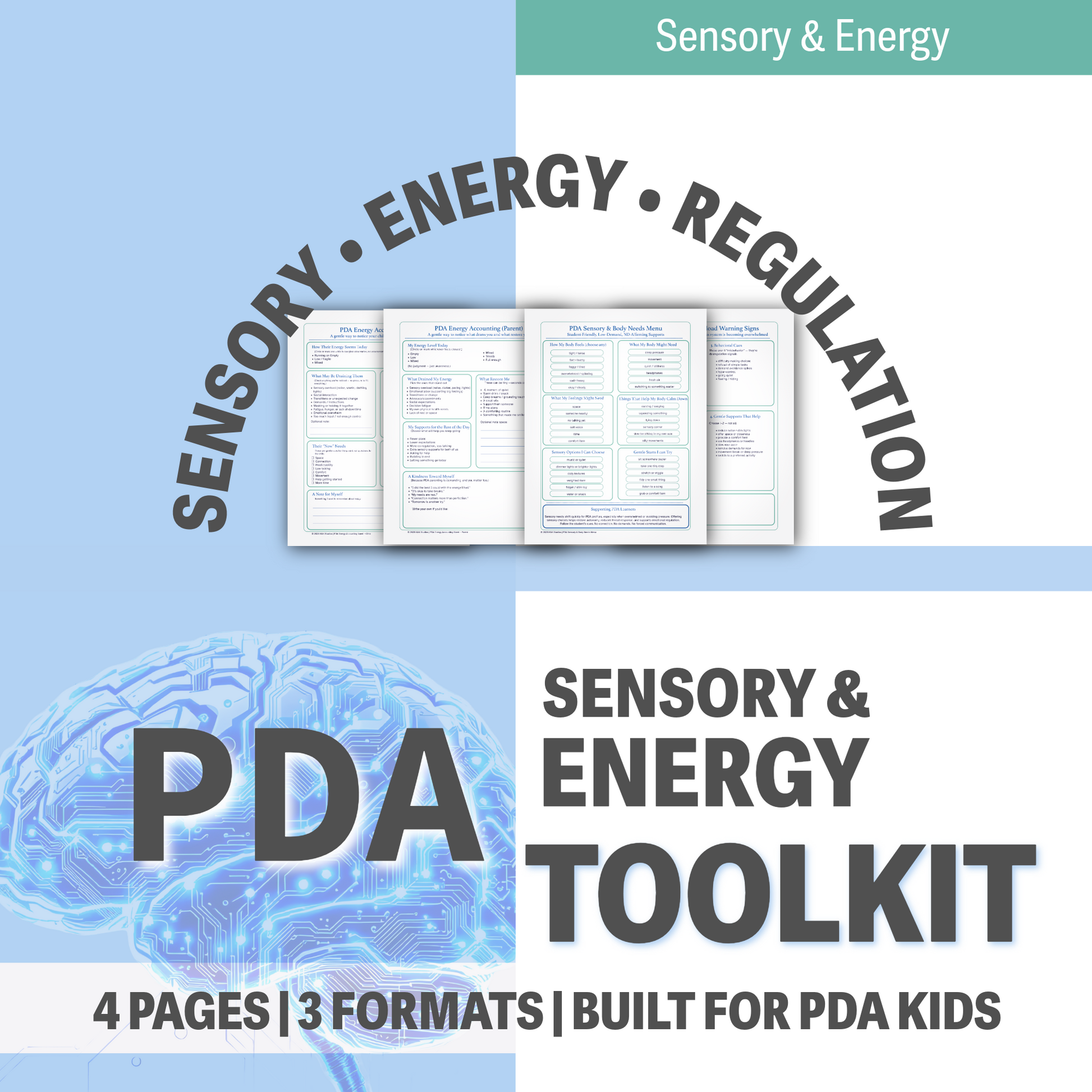 Understand your child’s energy levels, sensory needs, and early warning signs before overwhelm hits. The PDA Energy & Sensory Toolkit gives families, teachers, and therapists simple, visual tools to track regulation, prevent overload, and respond with low-demand support.