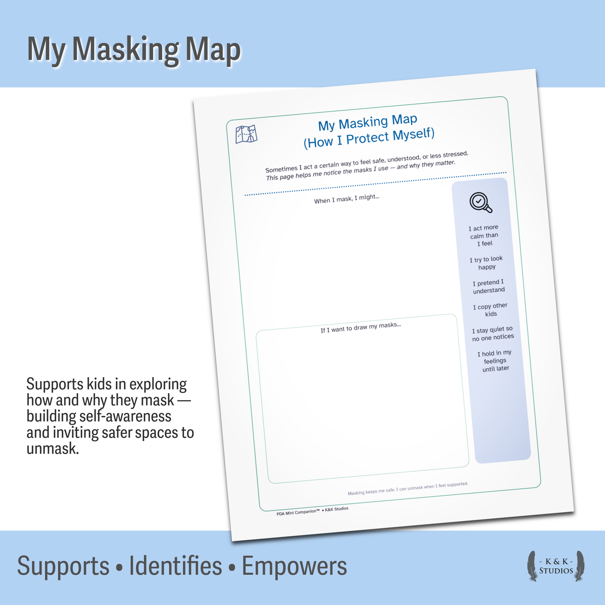 Helps kids explore how and why they mask, and what helps them feel safe enough to unmask.